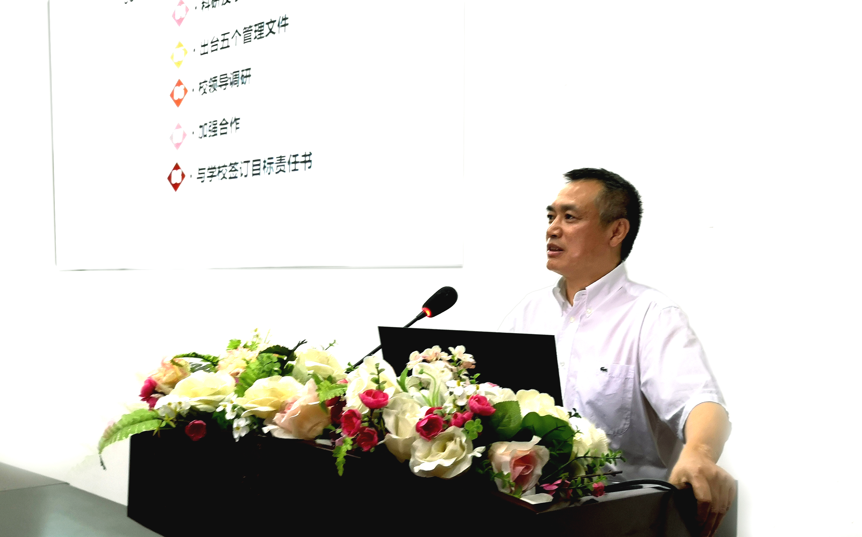 李昌龙书记首先报告了党委工作、师资队伍、人才培养、科研及学科建设、校领导调研、加强合作、与学校签订目标责任书等工作,结合宣讲校院两级管理体制改革,对党政工作、人才引进和青年教师培养、人才培养、科研平台建设等提出了新要求。