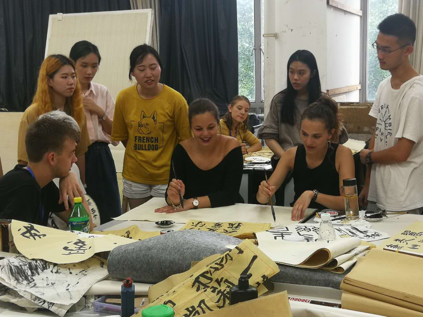 7月10日下午2:30,国际课程周的留学生和我院十几名学生一起参加了我院和艺术学院在江安校区共同举办的中华传统艺术体验课——书法。