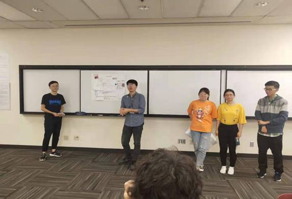 在小组展示中,同学们分为四个小组,在亚利桑那州州立大学学生志愿者的协助下,发现并选定一个与人类健康相关的问题,并基于此设想出解决此问题的创新方案。同学们围绕自己选定的问题,展开了激烈的讨论,并积极地为进行创新想法的展示做准备。讨论气氛十分活跃。