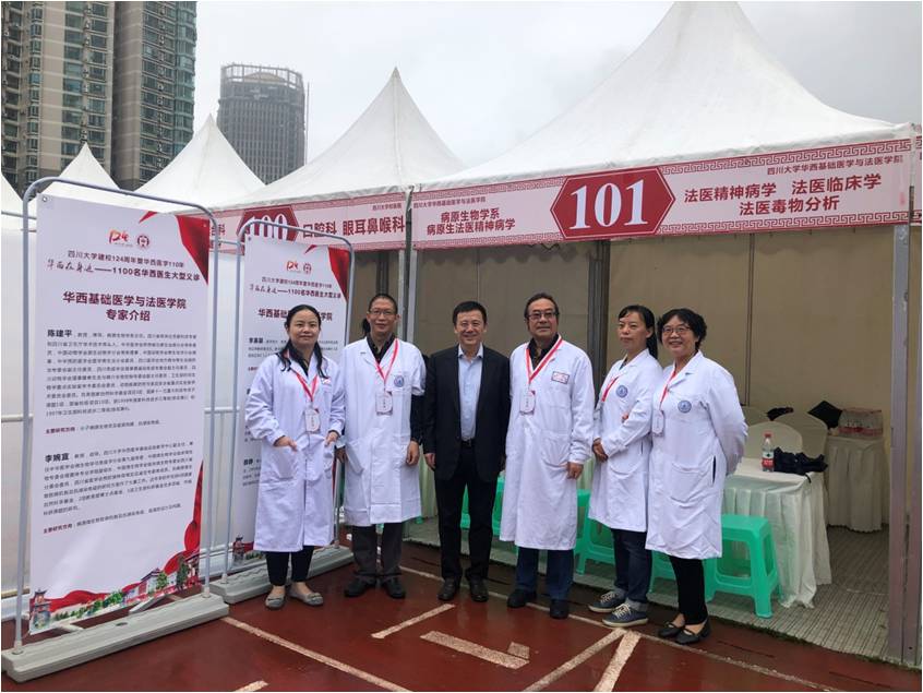 义诊现场,学院党委书记李昌龙陪同王建国书记、张林副校长到我院义诊点慰问义诊老师。我院共10位老师参与此次义诊活动,分别是:病原生物学系李婉宜教授、陈建平教授;法医精神病学教研室顾艳副教授、李钢琴博士;法医病理学教研室刘敏教授、代号老师;法医物证学教研室李英碧教授、颜静副教授;法医毒(药)物分析教研室廖林川教授、林瑶博士。