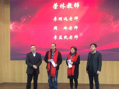 刘肖珩主席宣读2019年荣休教师名单,分别是:李明远老师、周玲老师、李益明老师。党委书记李昌龙、院长黄灿华为荣休教师颁发纪念礼品并对荣休教师数十年来对学院的贡献表达真挚的感谢与诚挚的祝福。