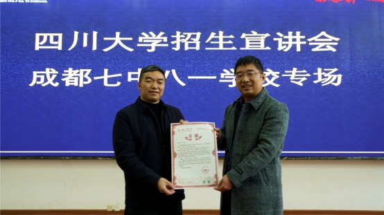 为做好我校招生宣传工作,吸引更多优质生源报考我校,1月20日,由招生办公室副主任廖爱民和我院副院长梁伟波带队,数学学院、化学学院、生命科学学院、电气工程学院、水利水电学院、网络空间安全学院、华西护理学院、华西公共卫生学院、华西药学院等一行16人组成宣讲团,赴成都七中八一学校开展招生宣传工作。成都七中八一学校校长张守和、教师代表及高一全体学生200余人参加了宣讲会。