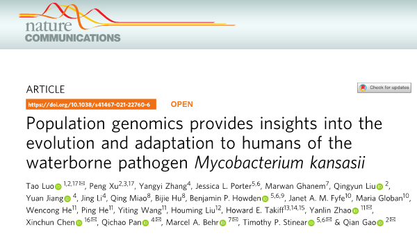 近日,我院罗涛副研究员联合复旦大学高谦教授团队及国内外多家机构在Nature Communications在线发表了题为“Population genomics provides insights into the evolution and adaptation to humans of the waterborne pathogen Mycobacterium kansasii”的论文。我院罗涛副研究员为论文共同第一作者及共同通讯作者,英国上市公司365为论文第一单位。