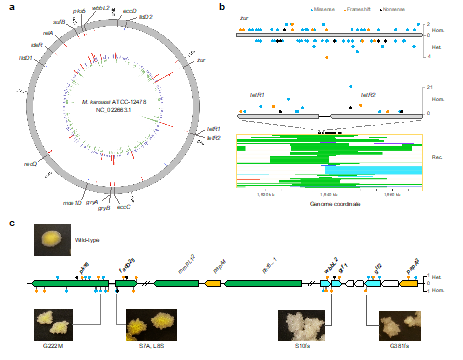 通过生物信息学及表型分析,本文进一步揭示了堪萨斯分枝杆菌一系列的宿主适应机制(图3),包括:通过可遗传变异上调锌、铁等金属离子摄取相关基因以抵抗宿主金属离子饥饿;通过启动子突变上调脂质转运及乳酸代谢相关基因增强其利用宿主营养物质的能力;通过基因失活突变特异性丢失细菌细胞壁亲水性脂质LOS,从而增强其细胞壁疏水性以适应宿主体内环境同时调控宿主免疫的机制。