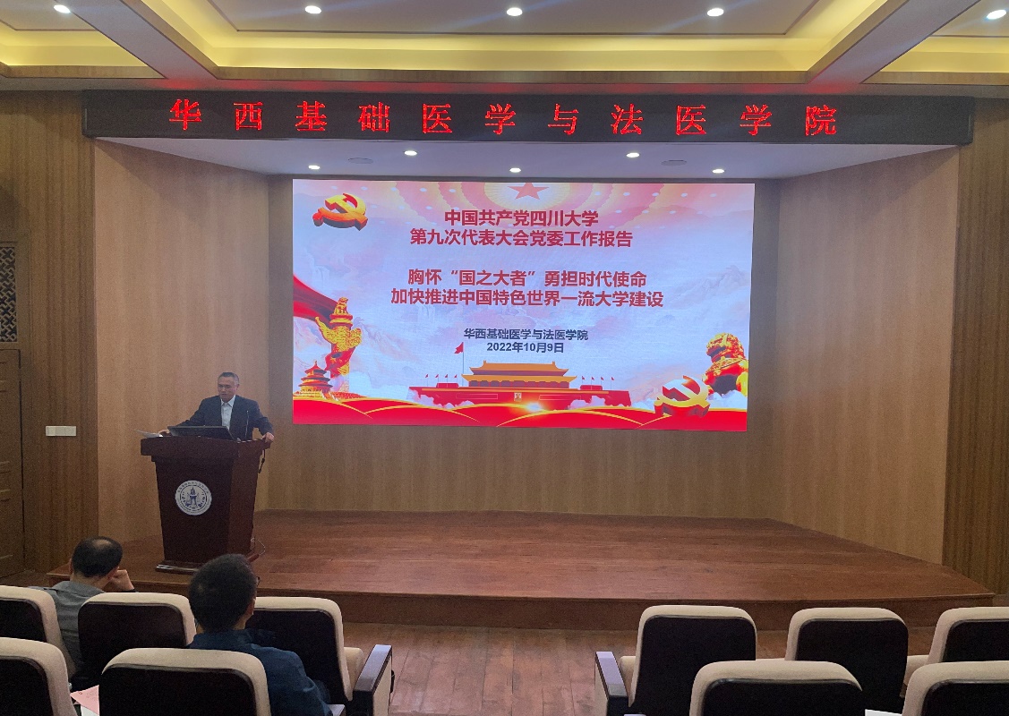 10月9日下午,我院在华西校区第五教学楼报告厅传达和学习了学校第九次党代会精神。学院领导班子成员、支部书记、教研室主任、科级干部、教师代表30余人参加会议,学院党委副书记陈维操主持会议。
