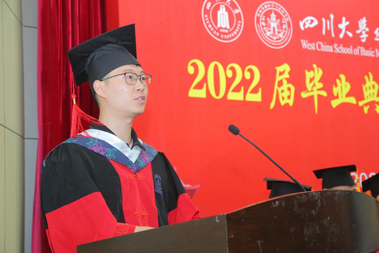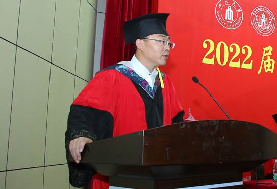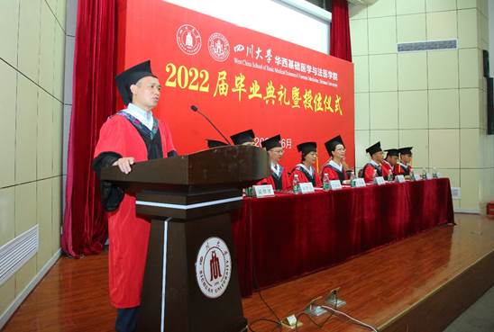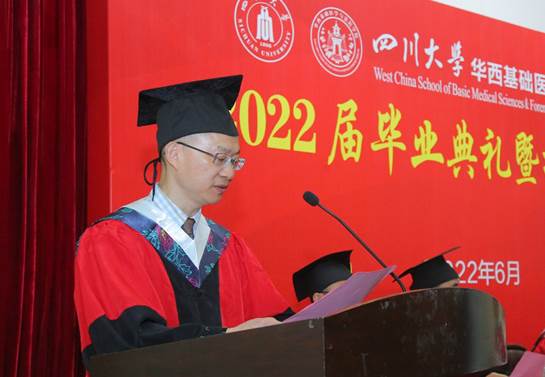 毕业典礼在庄严的国歌声中拉开序幕。院长李昌龙教授首先致辞,代表学院向2022届毕业生表示了衷心祝贺。他回顾了同学们在校期间通过不断努力所取得的成绩,为学院发展所做出的贡献。他嘱咐同学们在迈入新征程的时候,要传承川大红色基因,弘扬华西奉献精神,不忘老一辈医学专家为推动医学事业所贡献的力量;要增强自信,树立主人翁精神,积极主动作为,勇于承担解决国家发展重大需求和卡脖子难题的重任;要注重继续学习、善于学习,不断继续深造还是就业工作,都能不断提升自己竞争力,行稳致远;要坦率做人,踏实做事,把小事做好,精益求精,做一个值得信赖的人。最后,李院长祝愿同学们大展宏图,前程似锦,作为同学们永远的港湾,学院欢迎大家常回家看看。