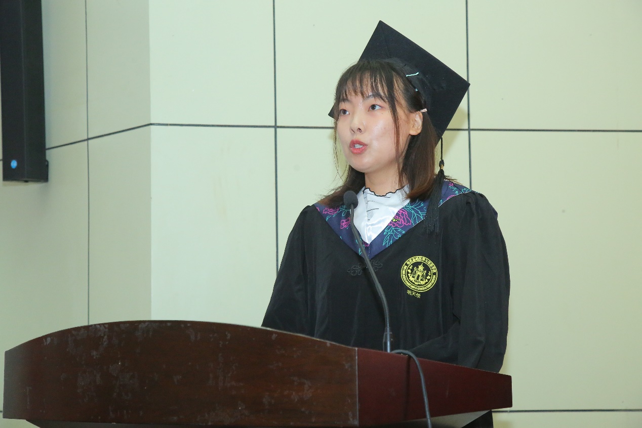明天悦和房飞同学分别代表本科和研究生毕业生发言,感谢学院与师长的悉心栽培。通过在校期间的学习、生活与科研,收获了优异成绩、深厚友谊和浪漫爱情的同时,更树立了“直面挑战、无畏向前”坚定信念。他们表示,即使心怀不舍,也将勇往向前,在人生新的里程中,努力沉淀,乘风破浪,实现自我价值的同时勇担时代使命,不负青春韶华。