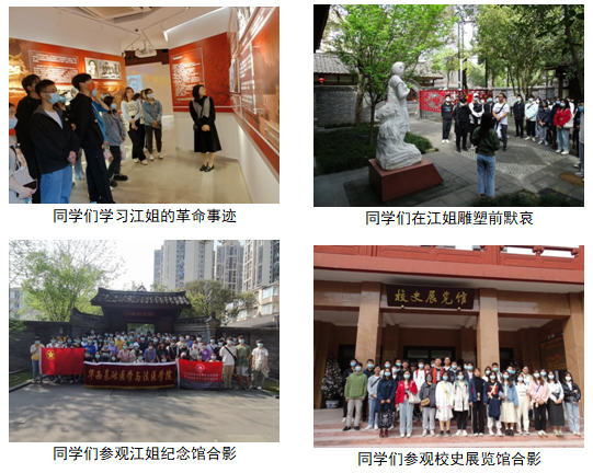 为引导广大青年学生坚定理想信念,增进家国情怀,传承红色基因,弘扬民族精神和时代精神,在中华民族传统节日清明节来临之际,我院于3月18日至4月1日,举行2022年“学习革命先辈崇高精神,争做又红又专时代新人”清明祭英烈主题教育活动,组织学生前往校史馆、江姐纪念馆、毛英才烈士塑像以及人民公园保路死事纪念碑参观学习,开展祭扫活动。