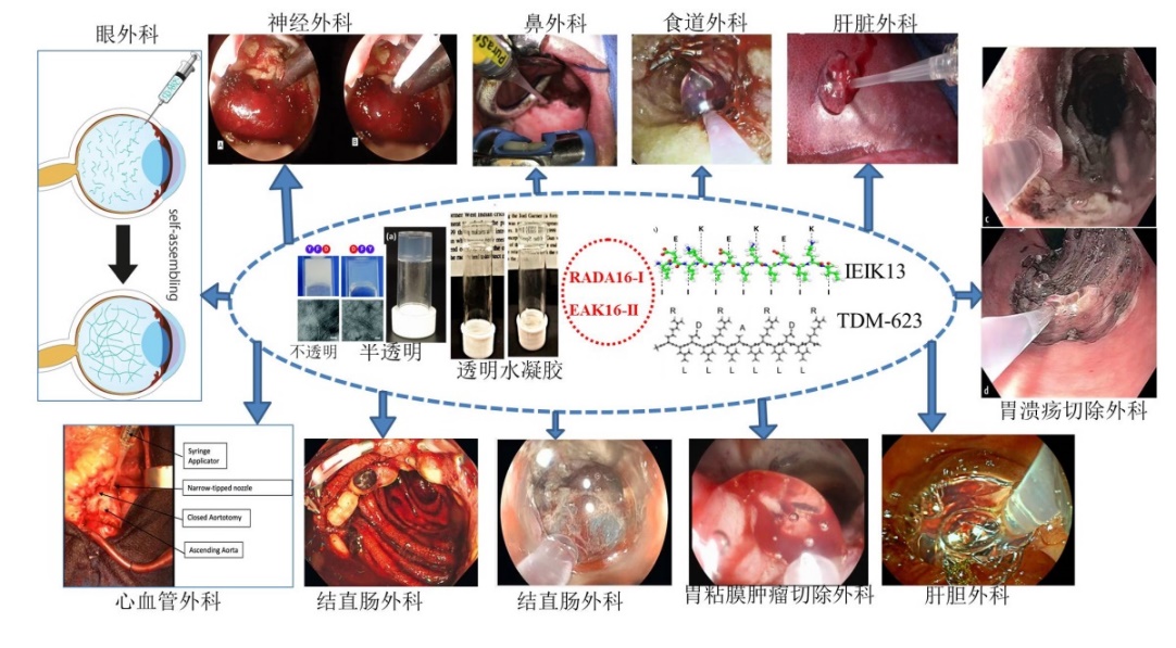 图4.短肽纳米纤维水凝胶生物材料在外科临床纳米止血技术上的应用(该图为不同大学医院或科研机构开展的临床或临床前外科止血技术或外科微创止血技术)。