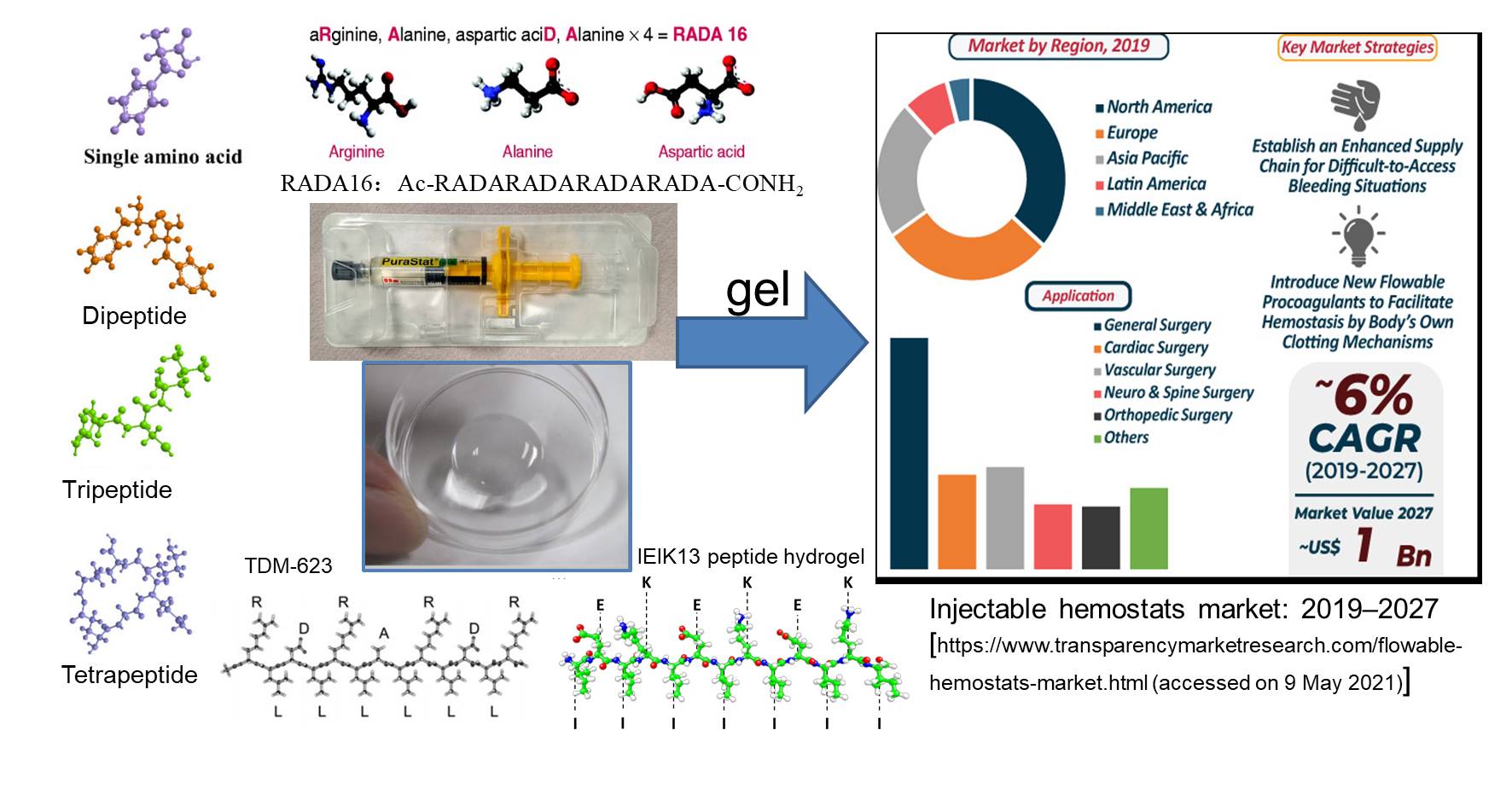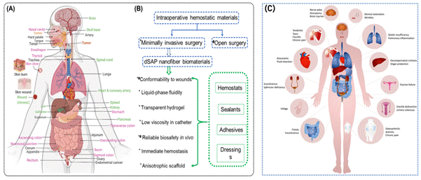 图2.自组装肽纳米纤维生物材料作为局部止血基质在外科临床和临床前研究中的医学应用及基于胶原蛋白的注射剂用于治疗疾病(包括牙龈、肌肉骨骼、泌尿生殖道、胃肠道等)相比较的部分非标准临床应用(Polymers (Basel). 2023 Feb 17;15(4):1020. doi: 10.3390/polym15041020)。