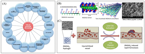 图3.理想伤口敷料的主要特性(Polymers (Basel). 2022 Jan 21;14(3):421.)及自组装肽纳米纤维生物材料的独特止血机制。