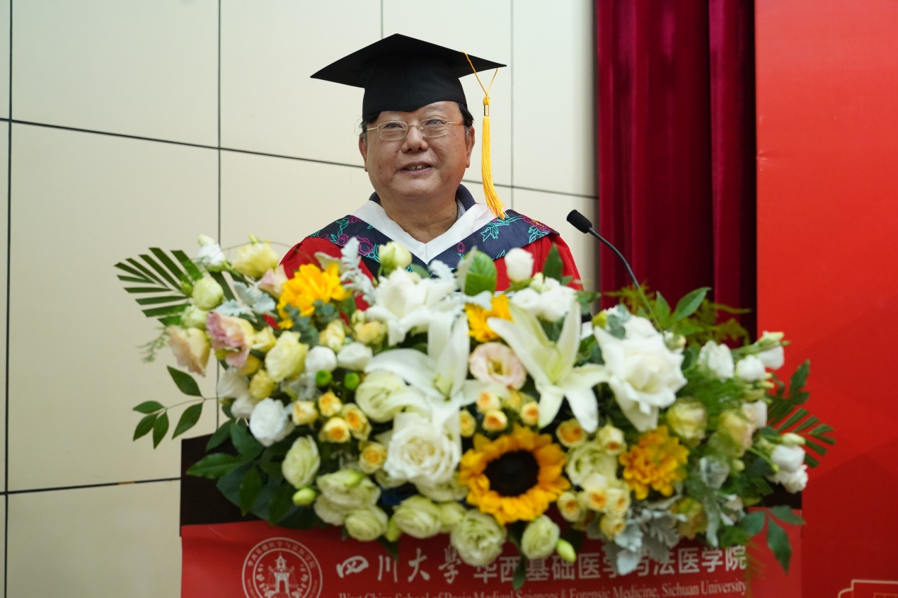 2018级基础医学专业沈诚忱同学和2020级法医学博士生朱强同学分别代表本科生、研究生发言,感谢学校和学院提供的学习环境和资源,感谢老师们的辛勤培育,感谢家长、同学们一路的支持和陪伴。他们分享了自己在校期间的收获与思考,希望同学们能在充满无限可能的未来中,披上百年华西的旷世风范战袍,以奋斗之青春担负起强国建设的重任,实现自己的人生价值,祝愿母校蓬勃发展、再书华章。