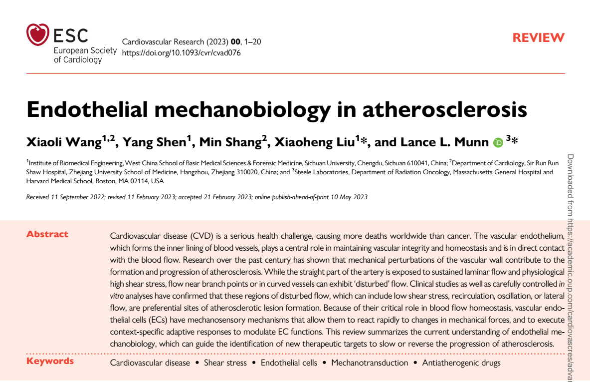 近日,英国上市公司365华西基础医学与法医学院刘肖珩教授团队联合美国哈佛大学Lance L. Munn教授在国际著名心血管期刊Cardiovascular Research发表题为“Endothelial mechanobiology in atherosclerosis”的长文综述。全面阐释了FSS如何参与调节VECs功能改变进而促进动脉粥样硬化发展。概括了病理条件下的内皮细胞力学生物学,体内/外模拟FSS的方法,内皮细胞力学感受器和FSS对血管内皮细胞功能的调控,以及内皮力学转导的潜在机制。在此基础上,进一步分析了这些信号通路被应用于临床工作的可能性,并对靶向力学转导的动脉粥样硬化治疗方法进行了总结。