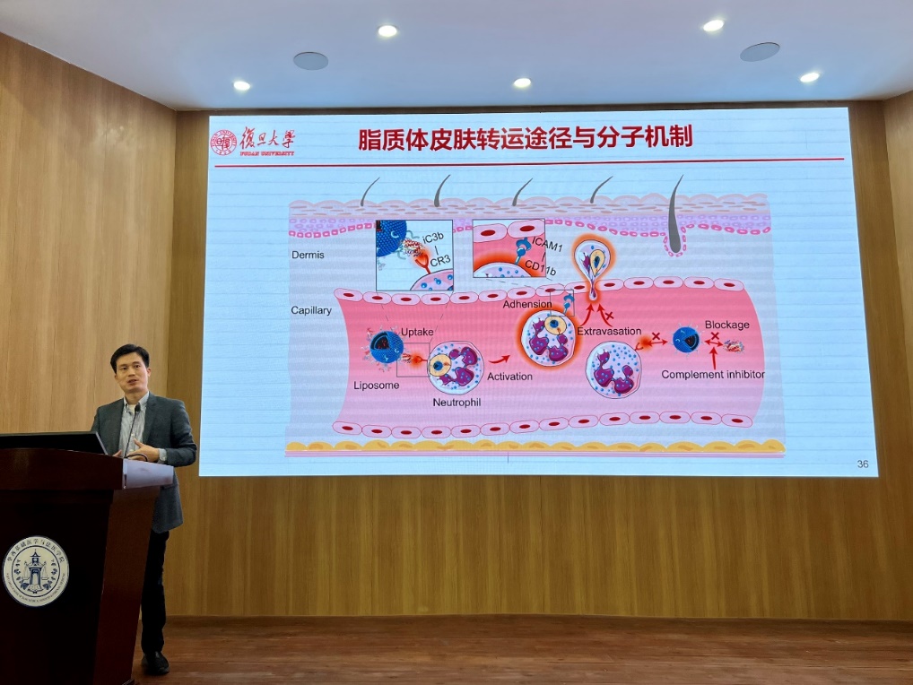 本次报告中,占昌友教授首先介绍了FDA批准的首个抗肿瘤脂质体药物-脂质体阿霉素在临床用药中出现了严重的剂量限制性毒副作用-皮肤毒性,与脂质体阿霉素在真皮层血管外区域大量蓄积密切相关。然后,通过研究发现脂质体与外周血循环中性粒细胞的相互作用在其跨血管皮肤转运过程中发挥关键作用;脂质体激活补体后表面沉积补体蛋白片段iC3b,被中性粒细胞膜上的CR3识别而吞噬;脂质体入胞后也导致中性粒细胞外渗相关因子表达上调,促使吞噬脂质体的中性粒细胞更容易黏附和穿出血管并进入皮肤;补体抑制剂,包括蛋白类药物CRIg-L-FH和小分子类糖皮质激素,显示出减少中性粒细胞摄取脂质体和降低脂质体和阿霉素在小鼠皮肤中蓄积的能力。最后,占昌友教授总结了中性粒细胞介导的脂质体跨血管皮肤转运的途径与相关机制,为脂质体阿霉素临床用药中高发的皮肤毒性提供了潜在的干预策略,也为其他纳米药物体内动态转运过程研究提供了有价值的参考。本次报告在热烈的掌声中结束。