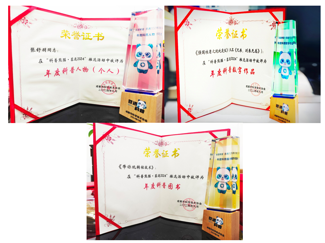 提升全民科学素质,协力建设科技强国。厚植新质生产力沃土,塑造高质量发展势能。近日,由成都市科学技术协会主办的“科普熊猫·蓉遇2024”推选活动在全国科普日主场活动中举办了颁奖仪式,现场揭晓了年度科普人物(团队)、年度科普图书、年度科普数字作品、年度科普活动及科学美空间五大类项目的获奖名单。学院张舒羽教授入选年度科普人物,张舒羽团队牵头编写的科普图书《带你玩转核技术》荣获年度科普图书,学院联合核工业四一六医院等单位共同创作的微电影《强国核盾之绝处逢生》荣获年度科普数字作品。