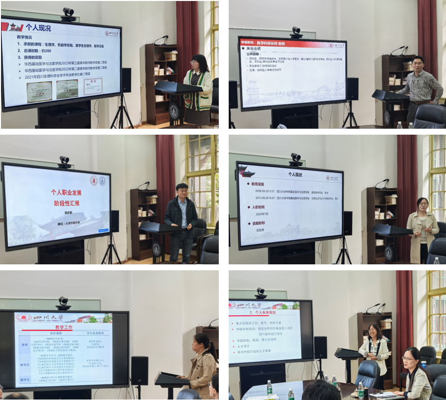 首先,6位青年教师针对自身职业发展的阶段性进展,包括取得的教学科研成果、未来的职业规划以及职业发展中的困惑等展开汇报。院领导、病生党支部书记、病理生理学教研室/机能学实验室主任和生理学教研室主任及其他参会人员针对青年教师们的困惑分享了自己的看法和经验,并提出了建议,鼓励青年教师发挥自己的优势,投身人才培养事业,潜心耕耘,同时积极与院外校外科研团队展开合作,开拓科研思维,找到自己的发展道路。