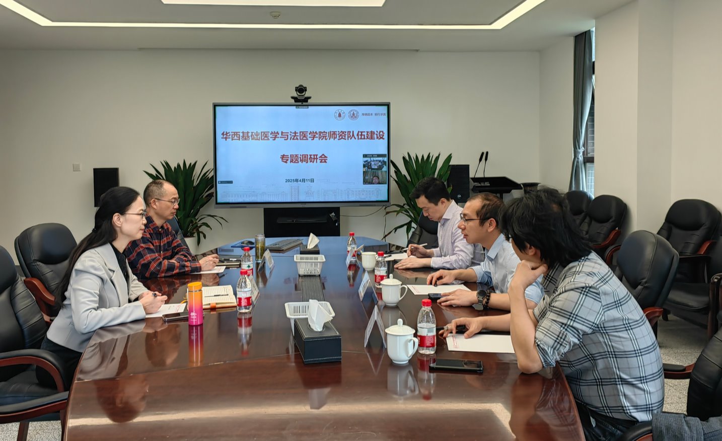 为进一步落实推进学校师资规模总量与质量核定,促进学校人才队伍建设,人才交流中心主任王茂华、华西医学中心办公室副主任孙建勋、建筑与环境学院党委书记兰中仁(线上)、哲学系副系主任余玥一行于2025年4月11日上午,来我院就师资队伍建设开展专题研讨会,我院党委书记李华、副院长刘肖珩、生理教研室主任杨文星、解剖教研室主任赵志伟及党政办、学科办相关人员参会。