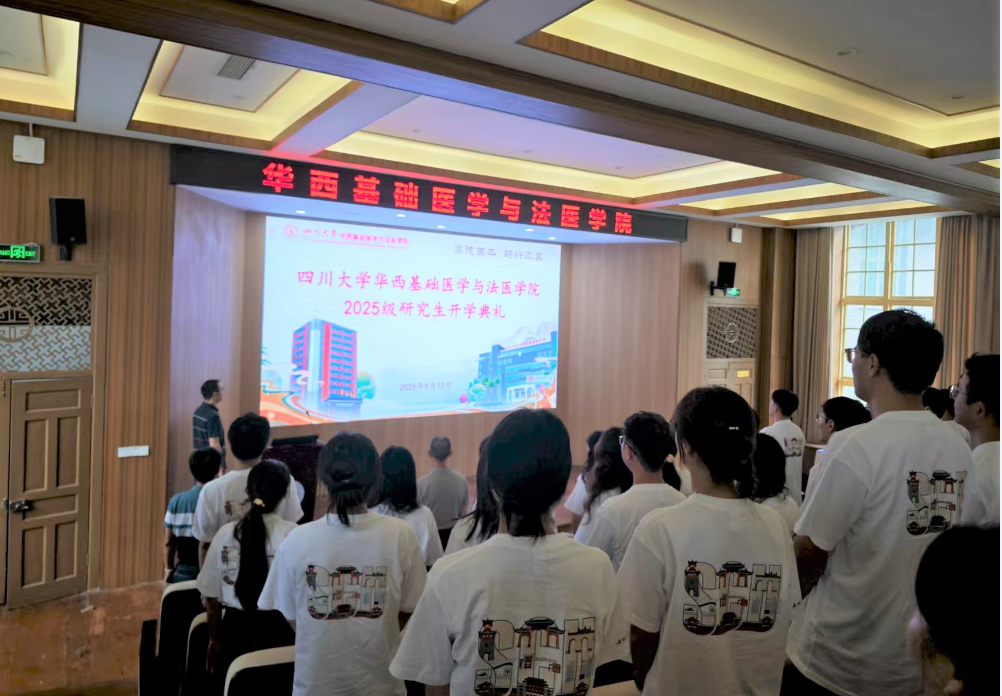 2025年9月12日下午华西基础医学与法医学院于华西第五教学楼报告厅举行2025级研究生开学典礼,典礼由罗海玻副书记主持。典礼在庄严的国歌声中拉开帷幕,学院领导、部分教师代表与全体新同学(硕士75人、博士27人)共同见证崭新征程的开启。