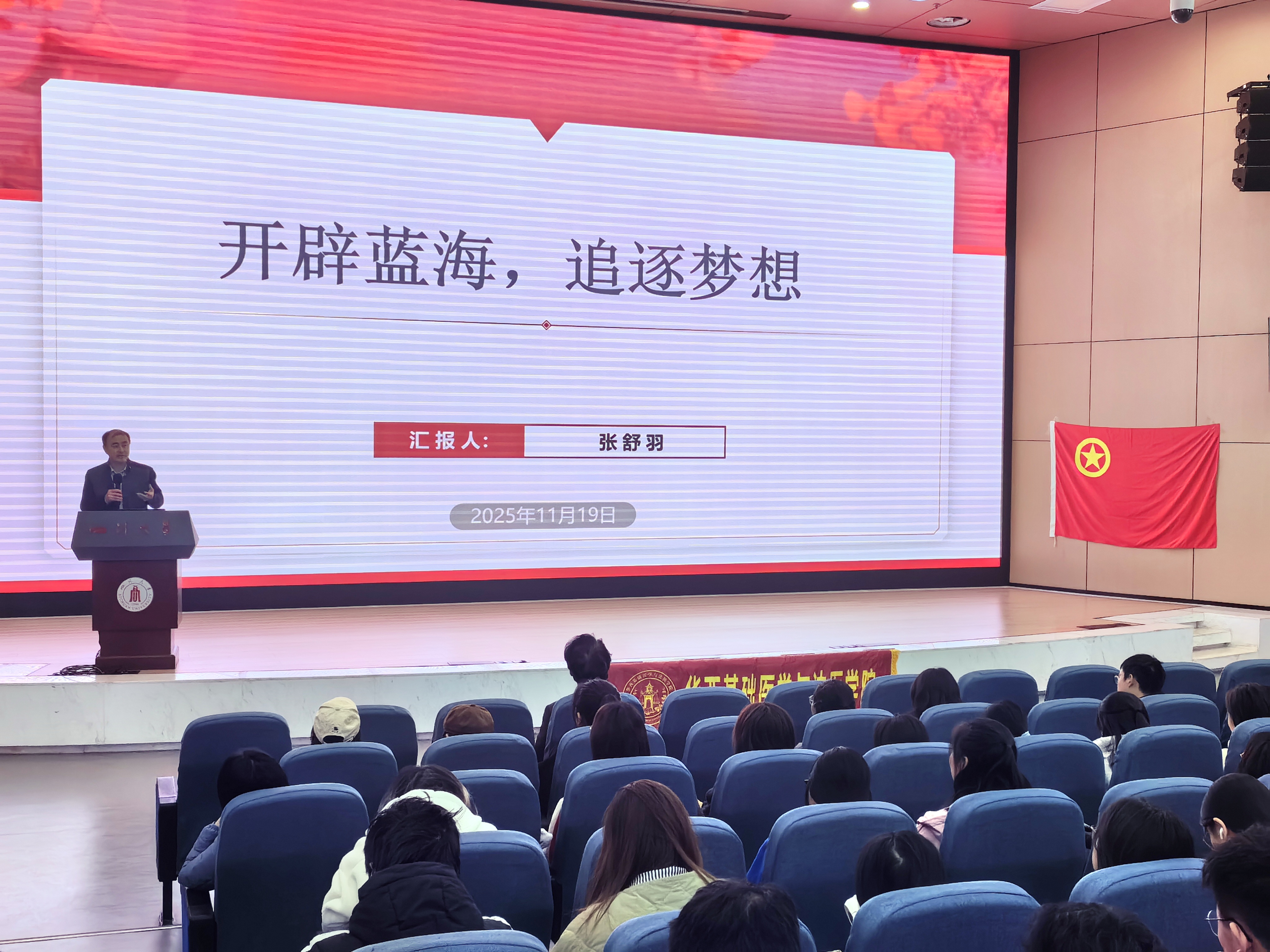第二十三届团校第二次行课伴随着中国共青团团歌正式开始。张舒羽教授以“开辟蓝海,追逐梦想”为题,由个人经历引入,围绕“医学温度——成果转化”“脚踏大地——探索未知”以及“另一只翅膀——核科学普及”三个维度,系统阐述了追逐梦想的多元路径。他以蓝天鹤先生的感人事迹为典范,深刻诠释了胸怀信仰、开拓思辨、坚持不渝的科学家精神,感召青年学子内化于心、外化于行。最后,他建议同学们从性格、人格、格局、能力、远见与决心六个层面持续锤炼,自我提升,并勉励大家善抓机遇、勇闯蓝海,将知识内化为开创未来的强大动能。