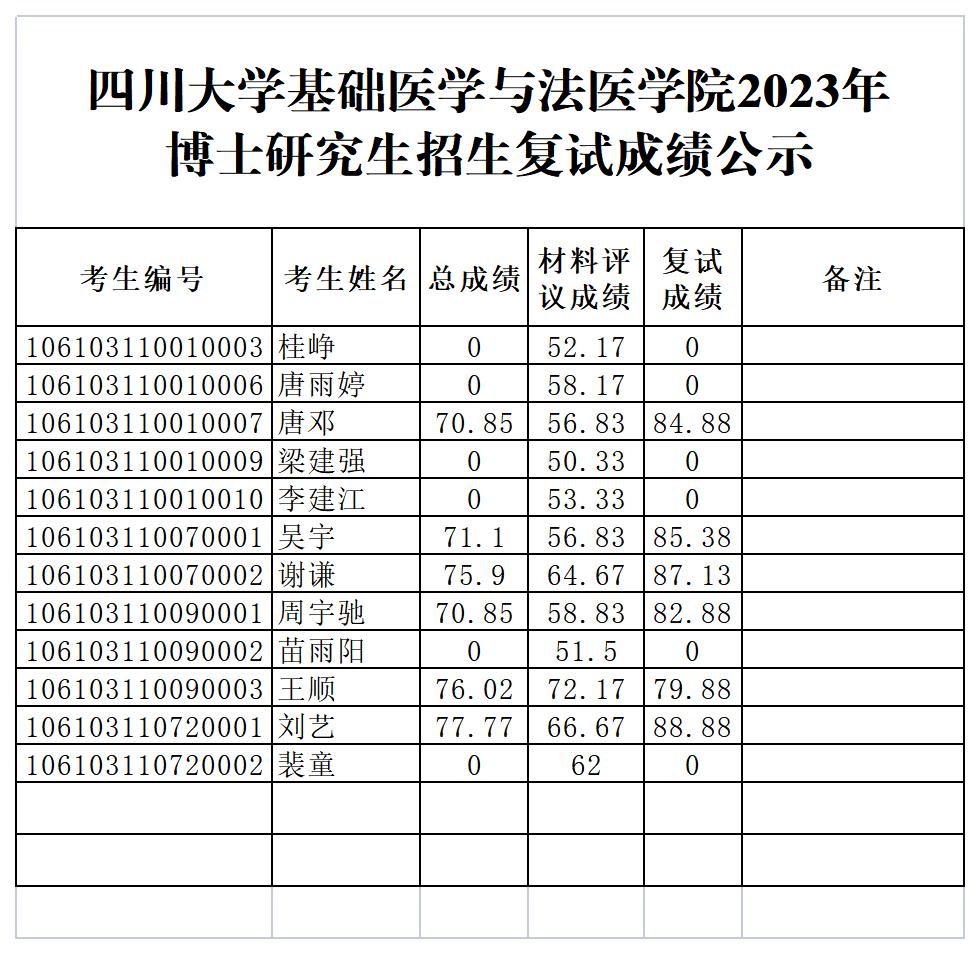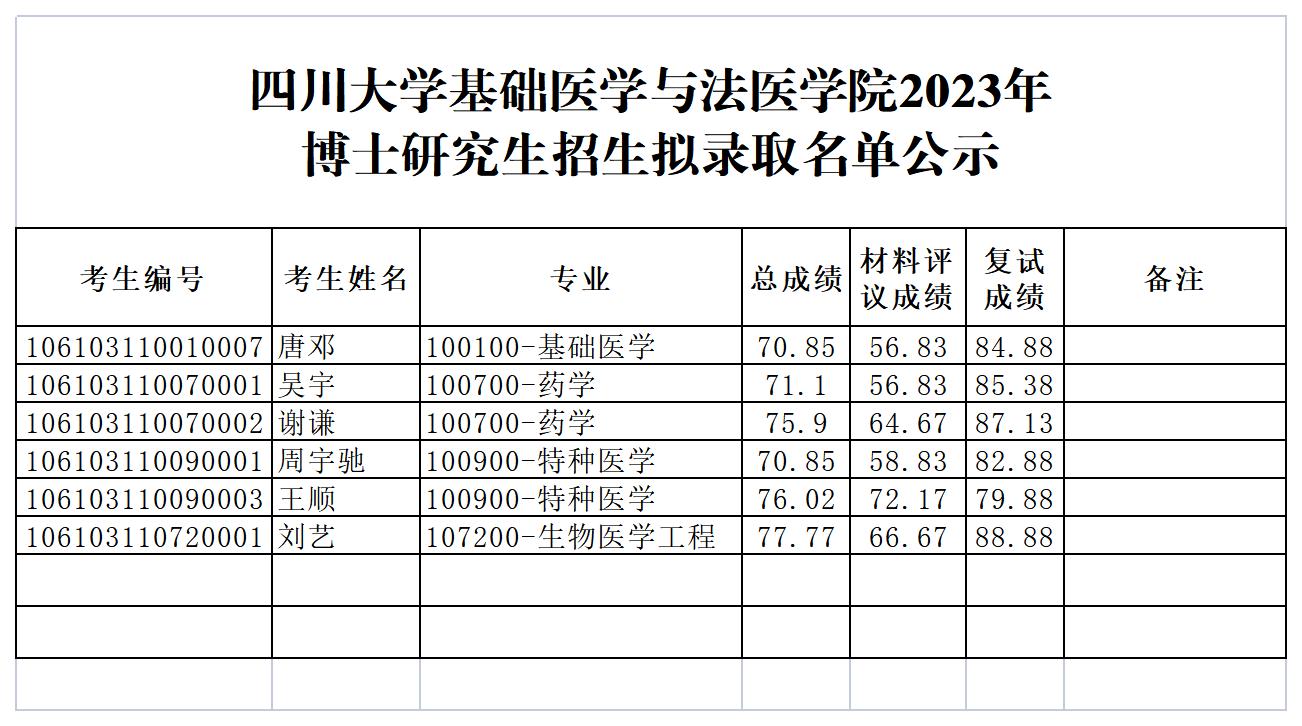 华西基础医学与法医学院2023年度博士研究生复试成绩及拟录取名单公示