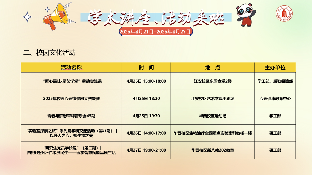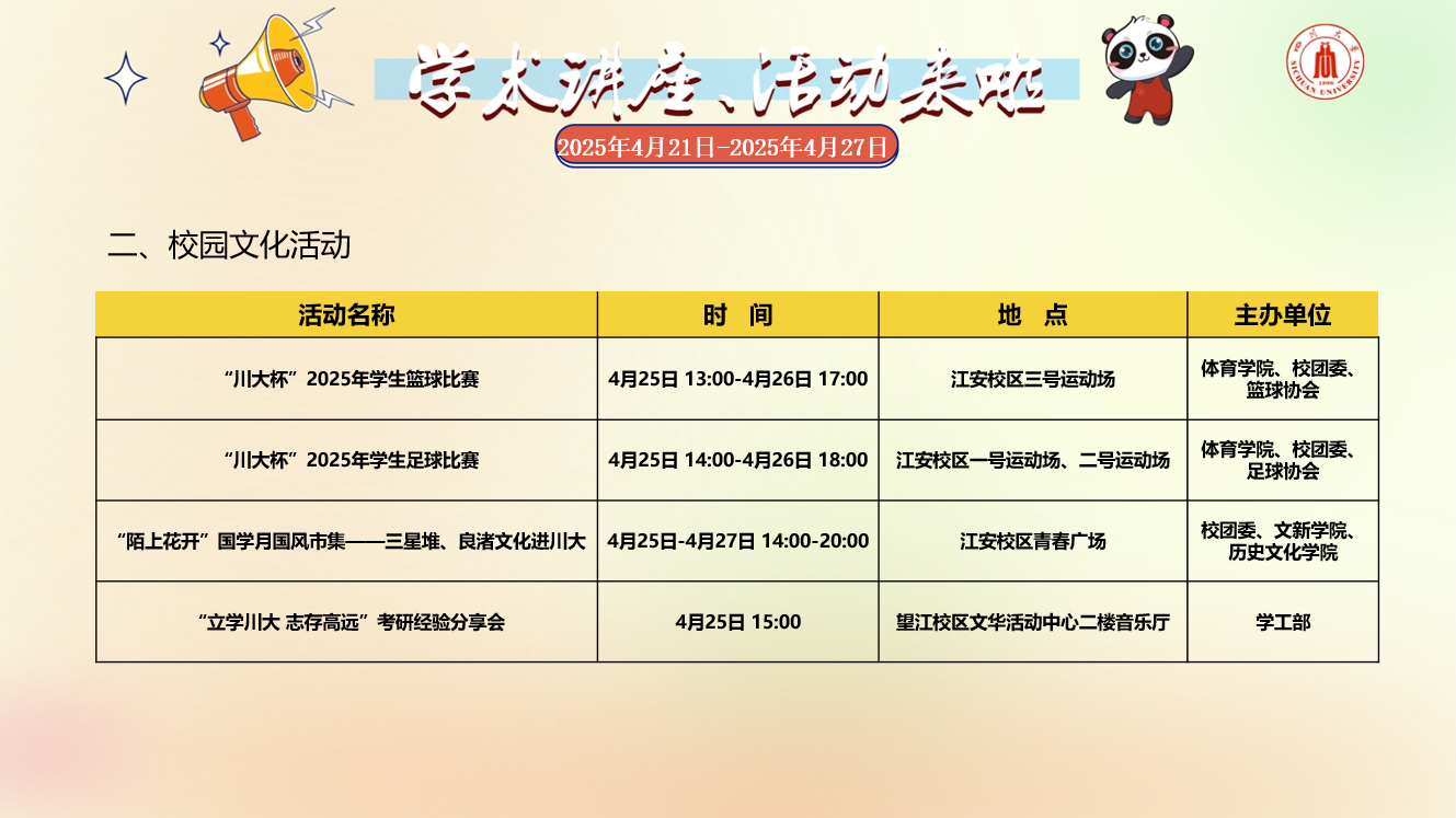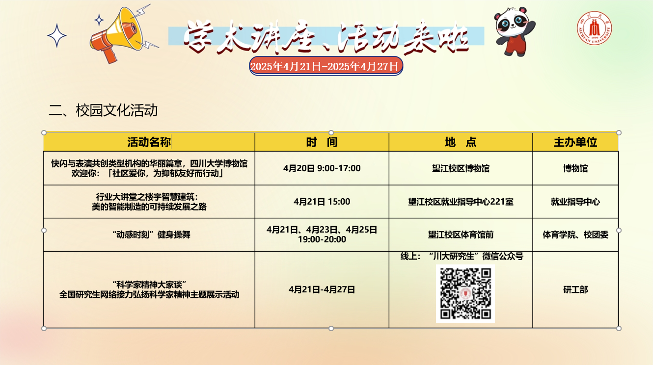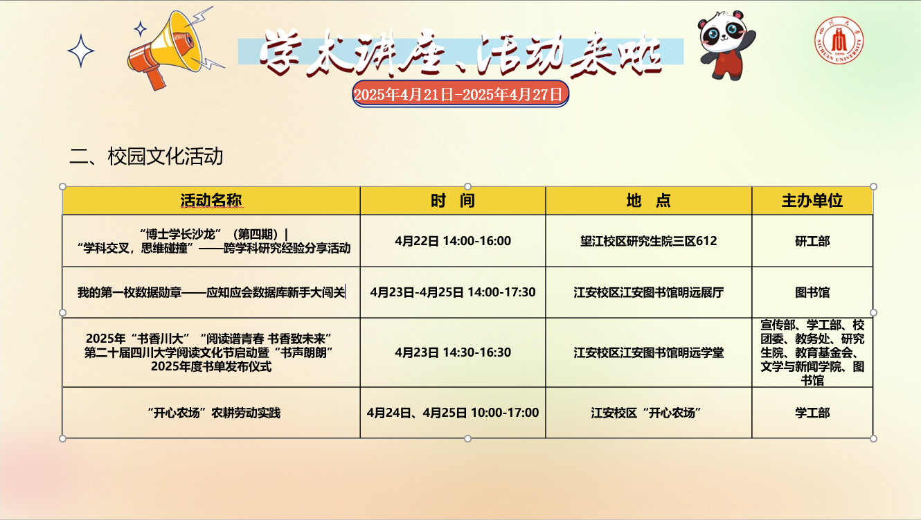 校内学术讲座论坛及校园文化活动预告(2025年4月21日-2025年4月27日)