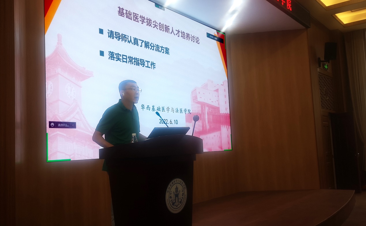 梁伟波副院长重点强调了基础医学拔尖创新人才培养相关问题,请导师认真学习、了解刚刚修订的拔尖、强基计划动态管理办法及分流实施方案,做好导师立德树人工作,真正实现基础医学拔尖创新人才的高质量培育。他鼓励大家能充分发挥自己及团队的教学或科研优势,探索教育新形态,有针对性地进行课程改革或孵化双创项目,积极进行各类项目申报,促进教-学-研协同发展,形成人人是标杆、门门是金课、处处是高地的国际一流教学体系。
