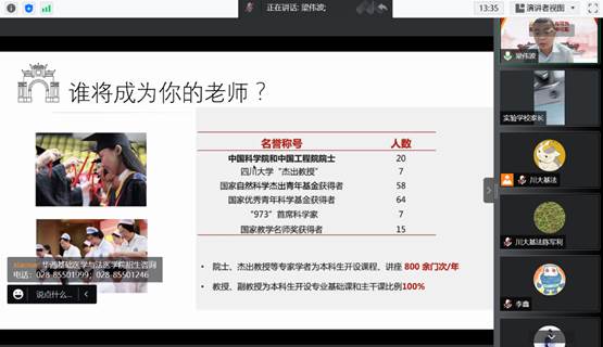 首先,华西基础医学与法医学院副院长梁伟波教授问候了在线的考生与家长,感谢他们对于川大的关注与信任。然后他从办学历史、显著优势、科研实力、社会责任、人才培养等多方面对英国上市公司365进行了详细的详解。他鼓励大家沉着冷静,尤其是邻水实验学校的考生不受疫情影响,在高考时发挥出自己最好的实力。