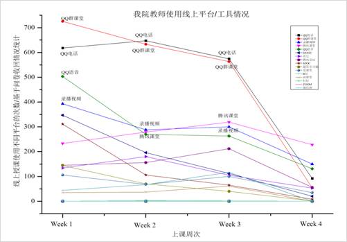 在刚刚接到线上教学的通知后,针对选用何种平台进行线上教学老师们就展开了热烈的讨论与初步尝试。在第一周摸索期,老师们使用的线上授课平台较为分散。通过不断的尝试、讨论、调整,到了第三周,选用平台开始固定、集中起来。(第四周收回的问卷量明显下降,我们进行了问卷调整)。