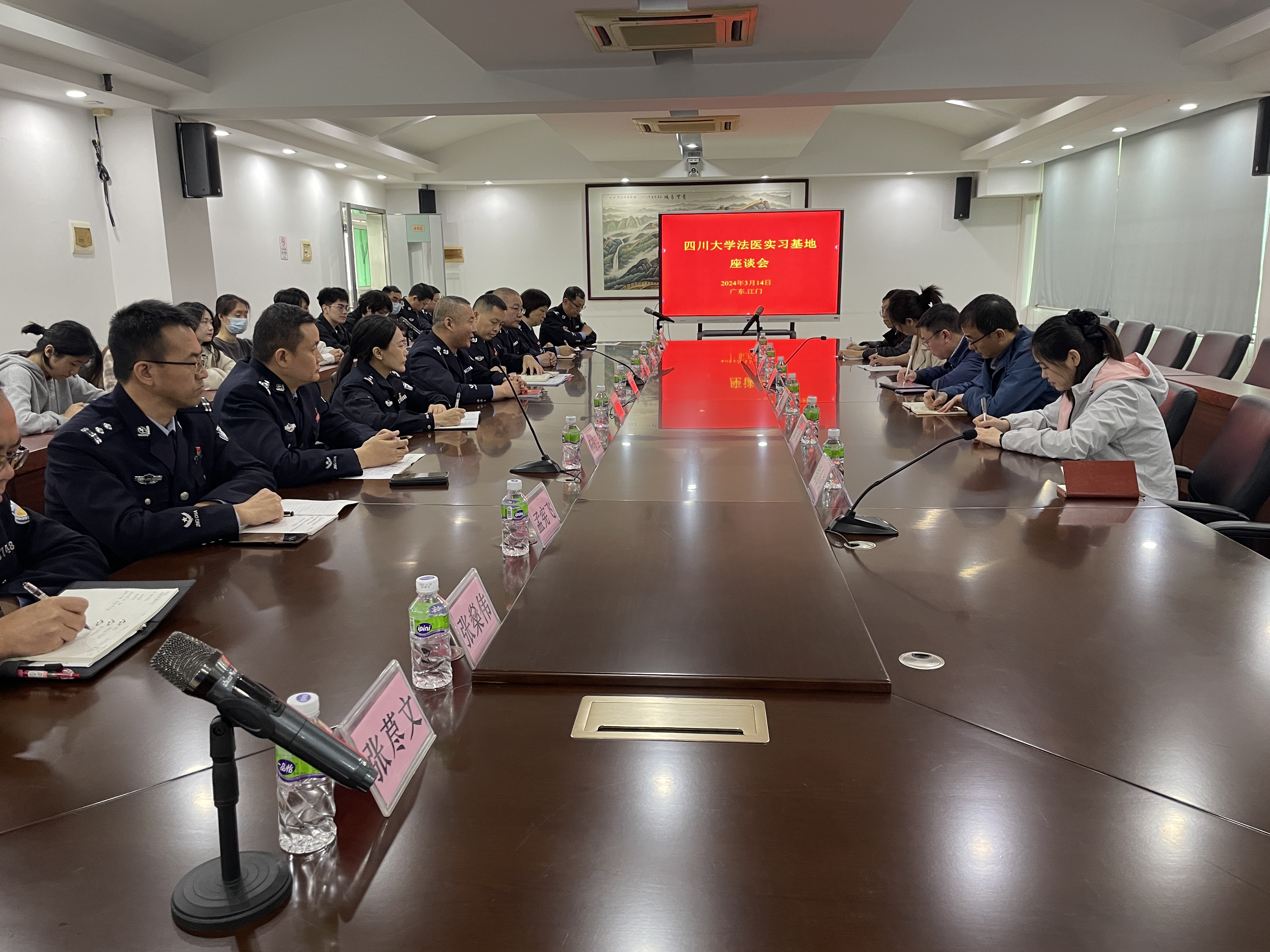为进一步了解法医学专业学生的实习情况,加强我院与实习基地的联系和沟通,3月14日,我院副院长梁伟波教授、副院长罗海玻教授带领法医毒物分析教研室主任叶懿副教授、法医物证教研室主任宋凤副教授及教学科相关人员,前往江门市公安局刑事警察支队进行调研。江门市公安局刑事警察支队副支队长李会军、江门市公安局政治处教务科副科长范慧敏、江门市公安局刑警支队三大队大队长司徒沛尧、江门市公安局刑警支队三大队警务技术二级主管李丽等人携所有实习生出席会议。