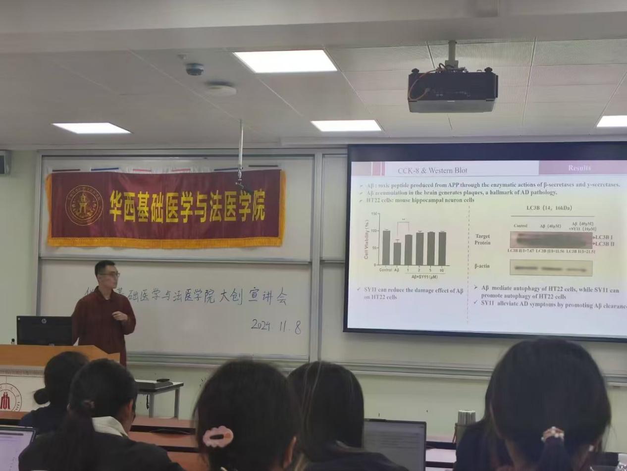本次宣讲会邀请了2024年度国家级大创优秀结项负责人、2022级基础医学(拔尖计划)的麻煜程同学,为参会学弟学妹们呈现了题为“Preliminary exploration on the anti-Alzheimer's disease effect and mechanism of a novel multi-target compound SY11”的精彩演讲。在演讲中,麻煜程同学从研究背景、研究方法及研究成果等方面,对过去一年的科研工作进行了全面的回顾与展示。同时,他分享了在选题过程中所遭遇的挑战与困难,以此激励学弟学妹们敢于探索,勇于尝试。