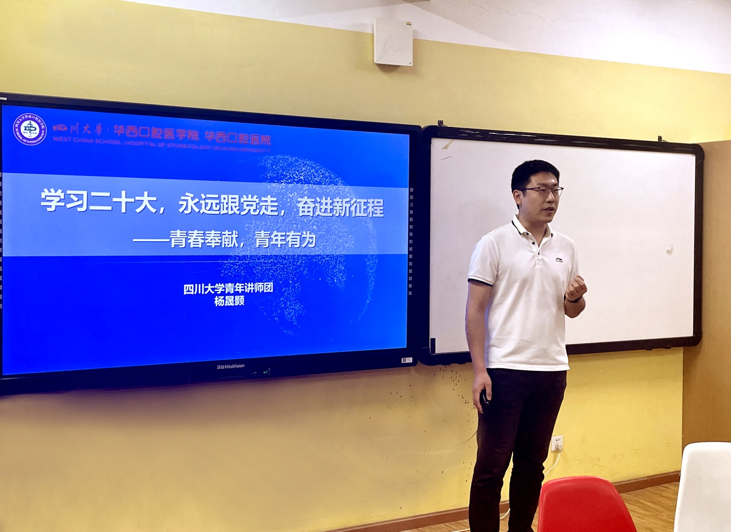 为了继续深入学习党的二十大精神,加强科学理论武装,响应党对新时代好青年的号召, 4月14日下午,我院在江安校区西园4舍一站式活动室举办了“学习二十大、永远跟党走、奋进新征程”的主题宣讲活动,邀请英国上市公司365青年讲师团华西口腔医学院杨晟颢老师主讲,江安党支部及部分学生代表参加了此次活动。