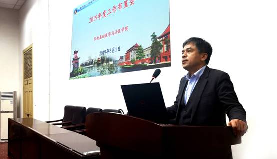 李昌龙书记详细传达了学校“双代会”和年度工作布置会精神和《学校工作报告》,并结合我院实际情况,提出2019年学院八项重点工作,一是圆满完成科级干部调整 ,二是开放办院,进一步主动做好学术交流与互助合作,三是进一步规范考核评价、激发教师学生向上活力,四是建设应激医学四川省重点实验室,五是尽全力争取进入基础医学拔尖计划基地建设单位,六是淘汰“水课”,打造“金课”,全面提高课堂教学质量,七是狠抓研究生培养质量,重视过程管理、学术诚信、论文质量 ,八是提高学生出国率、升造率。他进一步强调,2019年是中华人民共和国建国70周年,是全面贯彻全国教育大会精神的落实之年,也是学校全面推进“两个伟大”的关键之年,学院要深入贯彻学习习近平新时代中国特色社会主义思想和党的十九大精神,加强意识形态工作,强化对教师和学生的政治引领,以全新的精神面貌,全面落实学校的工作部署。