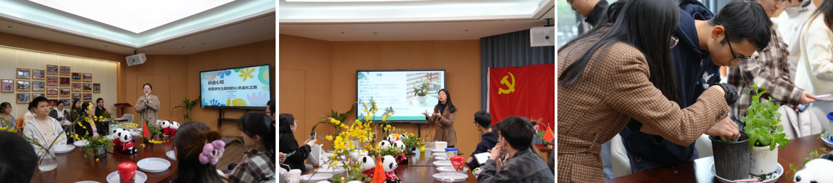 活动中,党员学长刘桂宏以《研途心程:探究研究生期间的心灵成长之旅》为题,结合科研经历分享成长感悟。专业园艺师王侨将植物养护与党性修养相结合,以石斛、三七、薄荷等植物特性为引,阐释艰苦奋斗、积极进取、永葆初心等精神内涵。师生党员在园艺师指导下亲手培土移栽,利用闲置茶杯、塑料器具等改造花盆,种下象征青春承诺的绿植。支部书记卢闻谦寄语党员:“要像照料绿植般培育初心,常修忠诚之根,勤施信念之肥”。