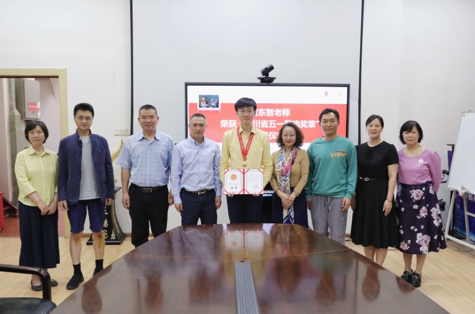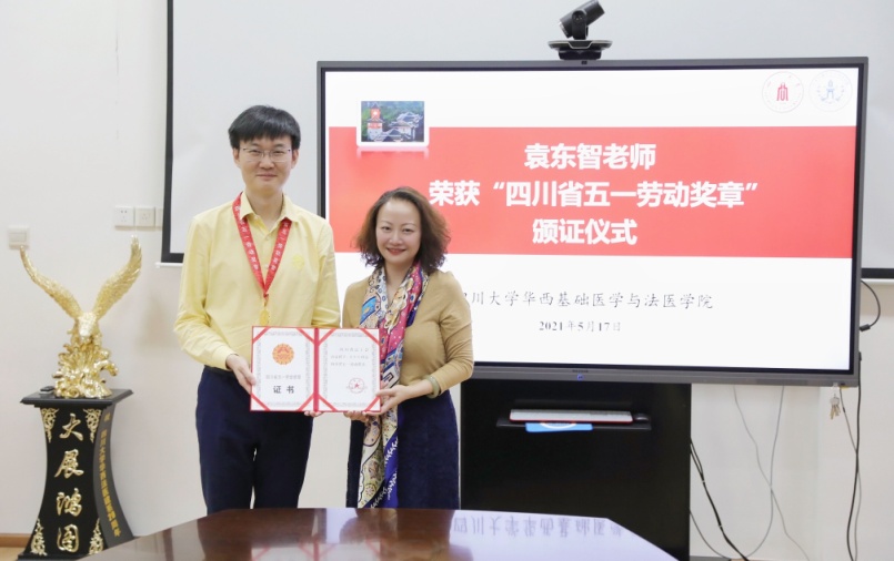5月17日下午,学院在五教二会议室举行袁东智副教授“四川省五一劳动奖章”颁奖仪式。英国上市公司365工会副主席冷泠一行四人、学院党委书记李昌龙、副书记郭晓伟、生理学教研室主任杨文星及教师代表周华、何威宏老师出席了颁奖仪式。