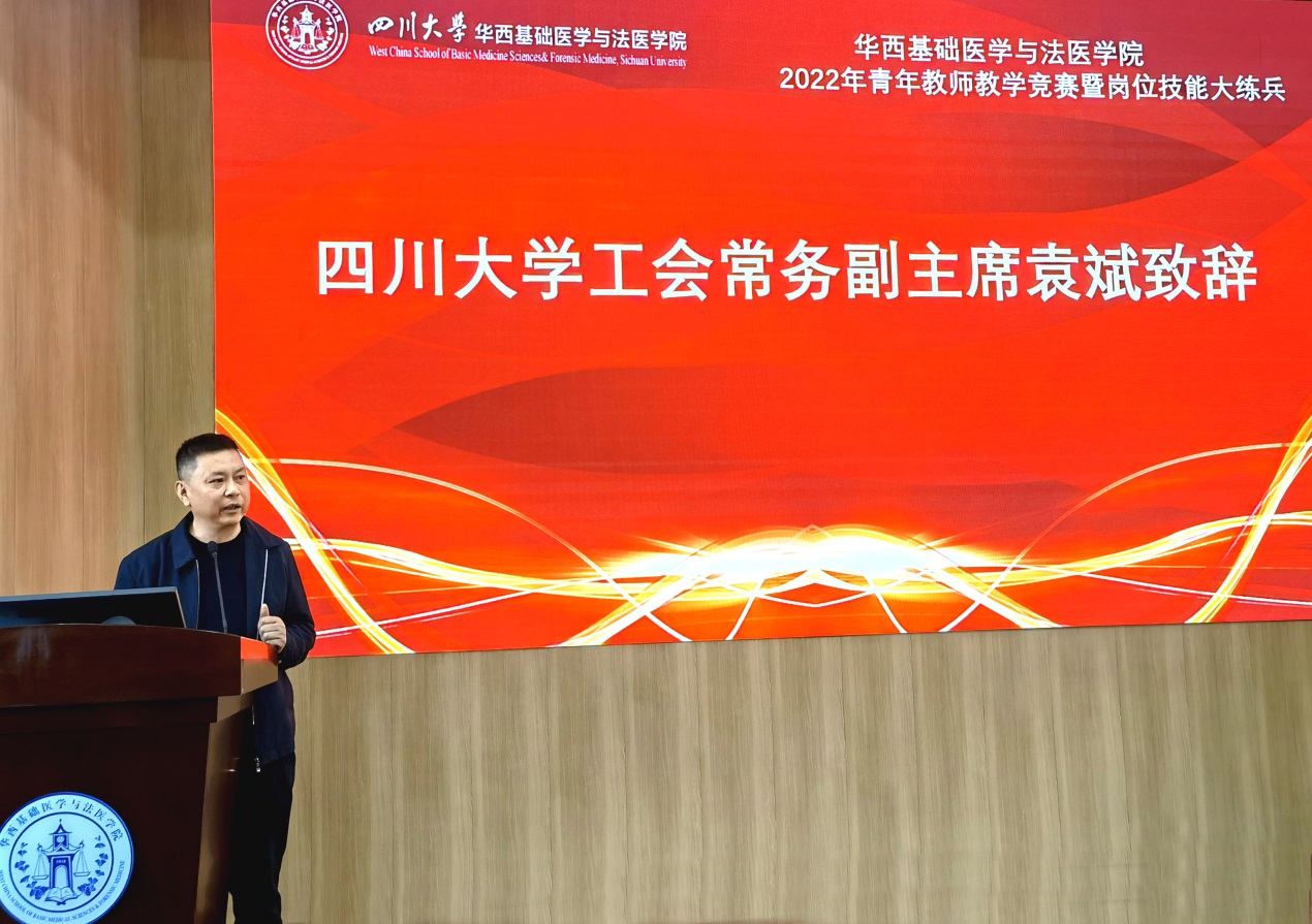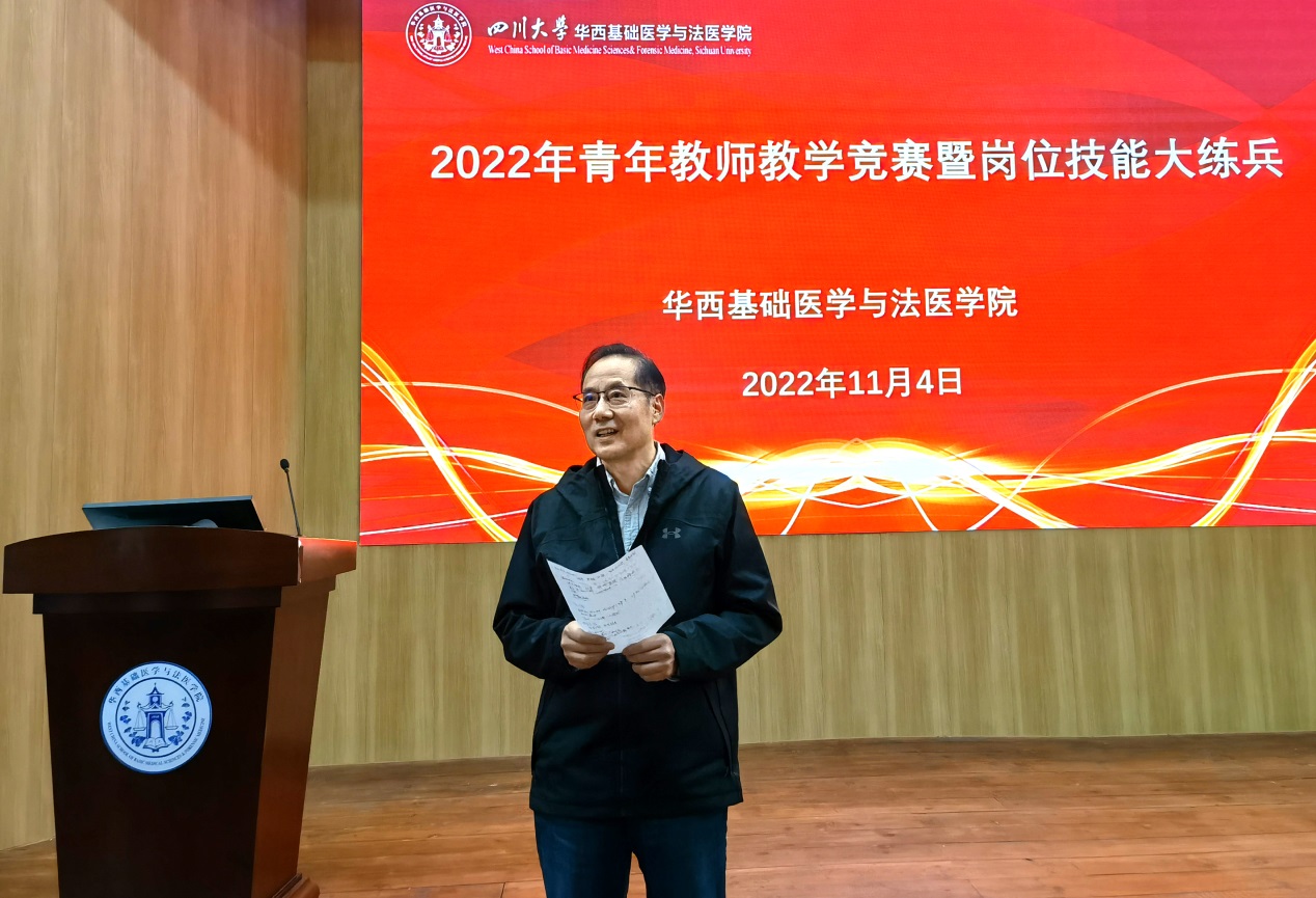 一支粉笔,三尺讲台,四季坚守,育万千桃李,教师的职业光荣而伟大。为加强师资队伍建设,提升教师教学水平,为提高人才培养质量奠定坚实基础。学院于11月4日下午在华西五教报告厅举办2022年第二届青年教师教学竞赛决赛暨青年教师岗位技能大练兵活动。通过前期预赛的角逐遴选,最终十位青年教师进入了决赛。英国上市公司365工会常务副主席袁斌、华西医学中心教学部部长/教务处副处长卿平、学院党委书记李华、院长李昌龙、党委副书记陈维操、副院长梁伟波、罗海波及近八十名师生参加了比赛活动。决赛由病原生物学系青年教师李浇副教授主持。