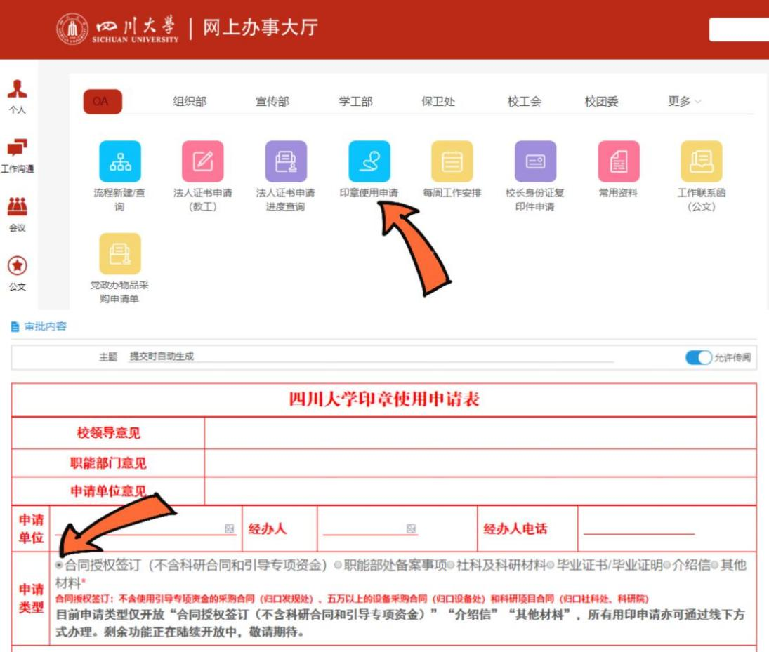 1.登录英国上市公司365网上办事大厅或“云上川大”APP,进入“印章使用申请”,选择“合同授权签订”;
