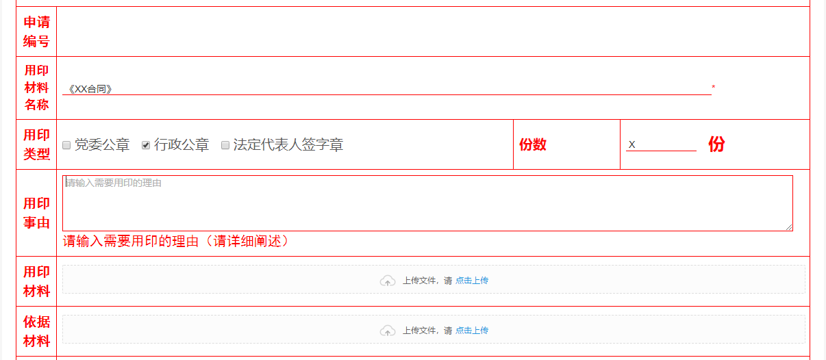 2.填写“用印材料名称”(XX 合同)、“用印事由”(申请授权的目的及背景、申请授权的内容、受托人及请求授权的期限,可参考附件请示模板),上传“用印材料”(拟签合同)和“依据材料”(选定供应商的佐证材料,如中标通知书、会议纪要等)。