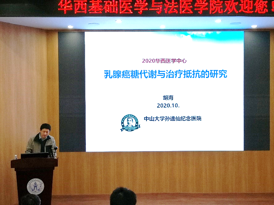 应我院邀请,2020年11月26日上午9:00,中山大学孙逸仙纪念医院胡海教授在华西校区五教报告厅做了题为“乳腺癌糖代谢与治疗抵抗的研究”的学术报告。