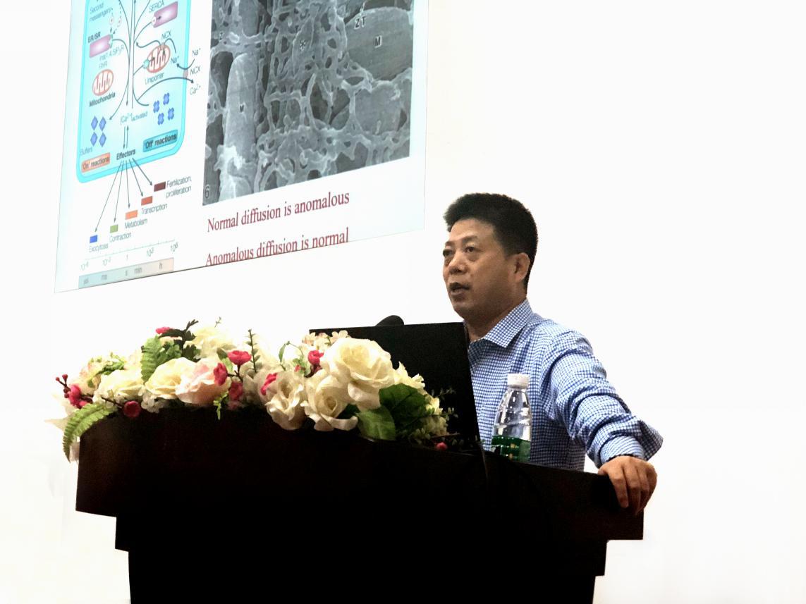 谭教授研究团队从生物力学的角度,深入研究了钙火花的扩散机制和影响钙火花的力学因素。在报告中,谭教授介绍到,心衰常伴随钙离子浓度增高,钙火花是钙致钙释放的基本单位,但以往构建的钙火花“Fick扩散”动力学模型与实验结果相悖,考虑到钙火花在细胞中扩散时的复杂环境,其团队构建了一种空间反常扩散模型,提出了钙离子在细胞内的扩散遵循空间反常扩散机制。谭教授团队对钙波和钙超载现象进行了深入的研究,构建了钙火花和钙夸克的统一力学模型,确定了游离雷诺丁受体对钙波、钙火花的影响,提出了“钙火花-扩散-钙夸克-钙火花”的新型钙波传播模式,明确了钙火花传播和终结的力学机制,这将有助于为探索心衰的防治途径提供力学生物学理论基础。