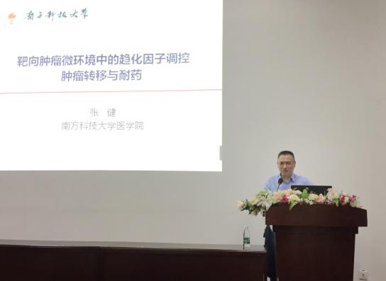 6月15日下午4点,南方科技大学张健教授应邀为我院师生做了一场题为“靶向肿瘤微环境中的趋化因子调控肿瘤转移与耐药”的学术报告。报告会在第五教学楼报告厅举行,由我院李昌龙书记主持。