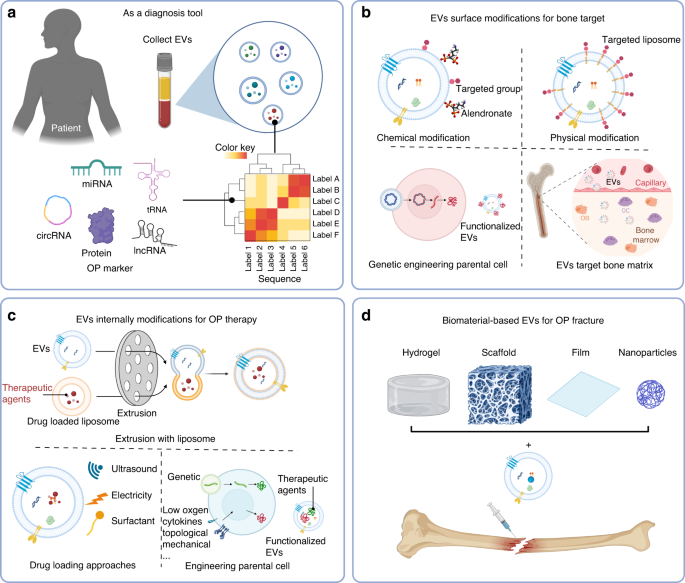 最后,总结了EVs在骨质疏松疾病中诊断和治疗的应用。包括通过测序和分析血液中EVs的含量,确定骨质疏松症的相关标志物。通过亲本细胞的化学修饰、物理修饰和基因工程,或与药物负载脂质体挤出、超声波、电刺激负载药物和亲本细胞基因工程等方式提高EVs骨靶向性能和治疗能力。此外,EVs还可以通过与水凝胶、支架和纳米颗粒等生物材料复合来治疗骨质疏松性骨缺损。
