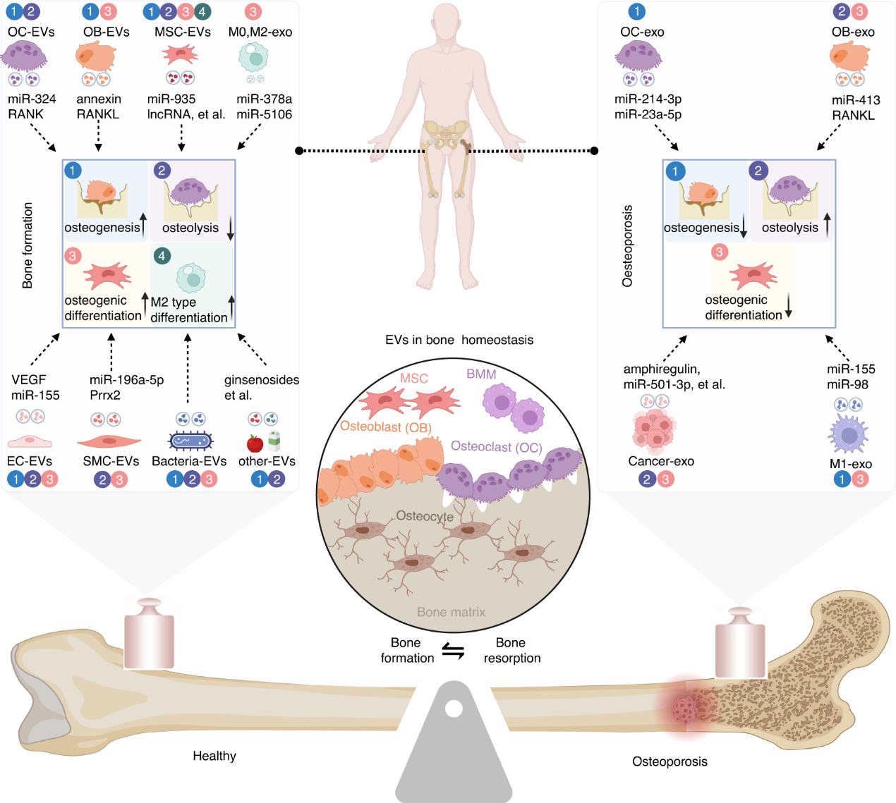 骨质疏松症一种以骨量低下、骨组织微结构损坏,导致骨脆性增加,易发生骨折为特征的全身性骨病。大量研究证实,细胞外囊泡(EVs)在调控骨稳态的复杂机制中发挥重要的作用,这些囊泡在病理和生理环境中都起着至关重要的作用,而不同来源的EVs对骨质疏松症有明显且不同的影响。