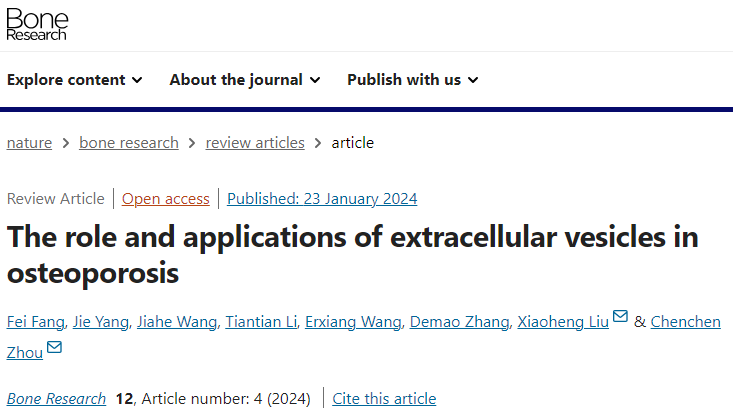 近日,英国上市公司365刘肖珩/周陈晨团队Bone Research杂志发表了题为“The role and applications of extracellular vesicles in osteoporosis”(2024 Jan23;12(4))的综述。回顾了目前EVs对骨稳态影响的研究进展,包括EVs的分类、生物发生以及EVs在骨质疏松症中复杂的调控机制。此外,概述了使用EVs诊断和治疗骨质疏松症的最新研究成果。最后,讨论了EVs在骨质疏松症中的应用转化研究的挑战和前景。英国上市公司365华西基础医学与法医学院的刘肖珩教授和英国上市公司365华西口腔医院的周陈晨教授为本文通讯作者,英国上市公司365华西基础医学与法医学院的房飞助理研究员为第一作者。
