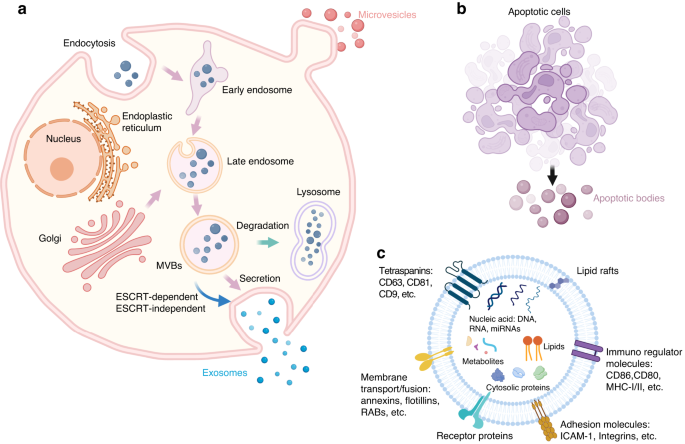 首先,作者简要概述了胞外囊泡的生物发生、转运内化和分离纯化方式,包括胞外囊泡的分类、生成和内化、内部货物和提取纯化方式等。