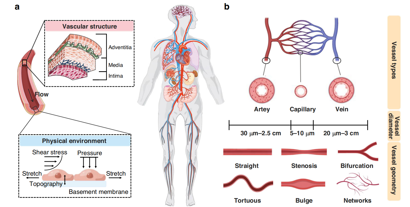 a血管的三层结构特征,包括内膜、中膜和外膜;b根据血管在大小、结构和功能上的差异,可将其分为动脉、毛细血管和静脉,基于血管复杂的形态,可识别出多种几何类型,如狭窄、分叉和弯曲等。