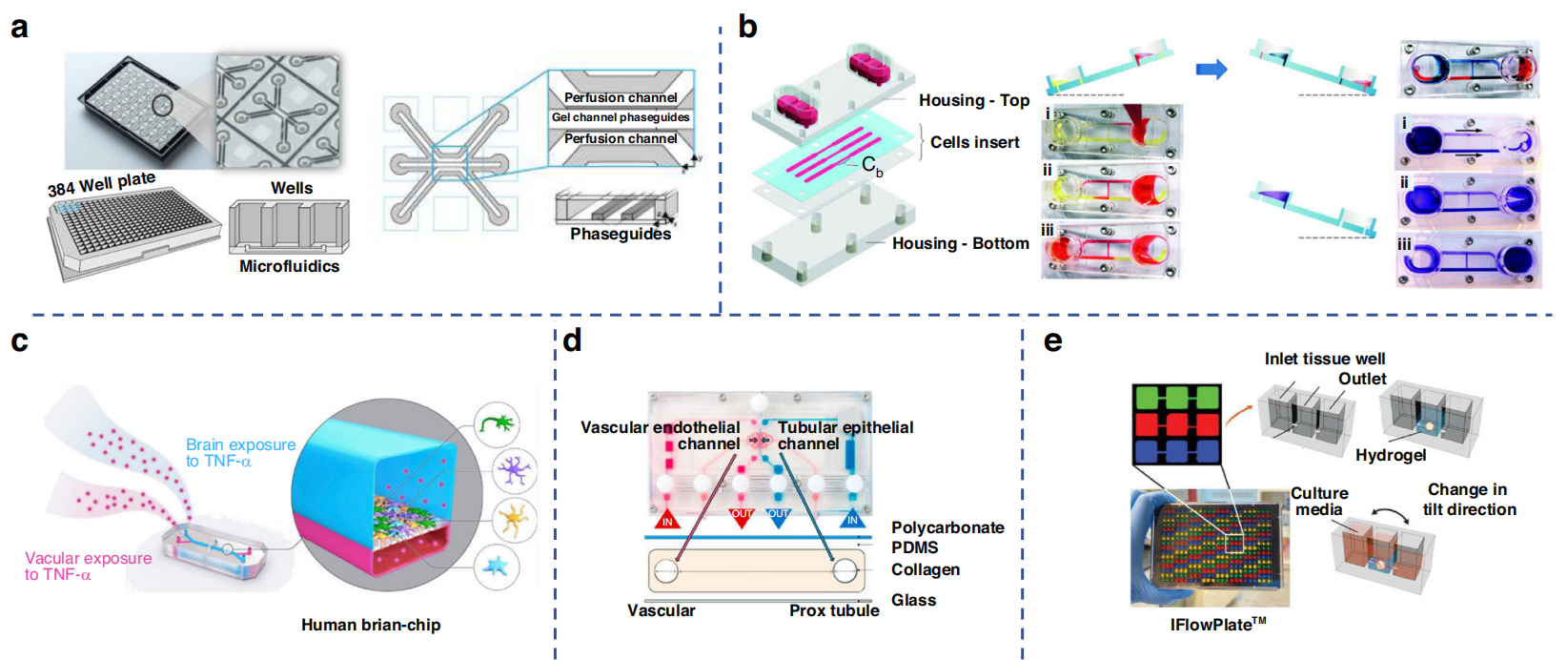 a基于384孔板的OrganoPlate®平台;bBiChip的分解示意图;c双通道微工程脑芯片的示意图;d用于建立VPT-MPS的Nortis双通道平台;eIFlowPlate模型以及该装置中培养的类器官血管化的实验设置示意图。