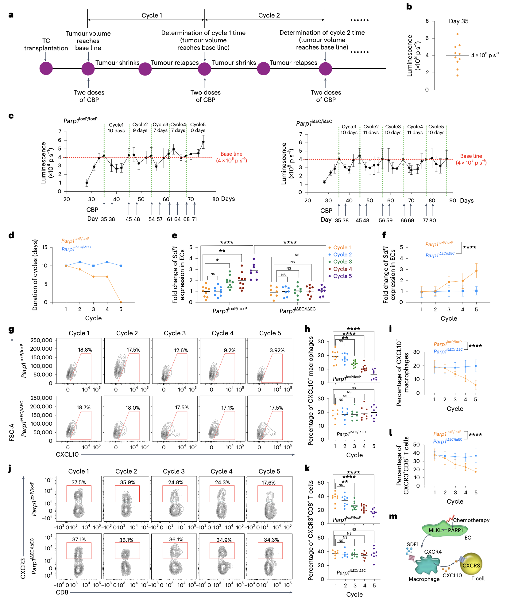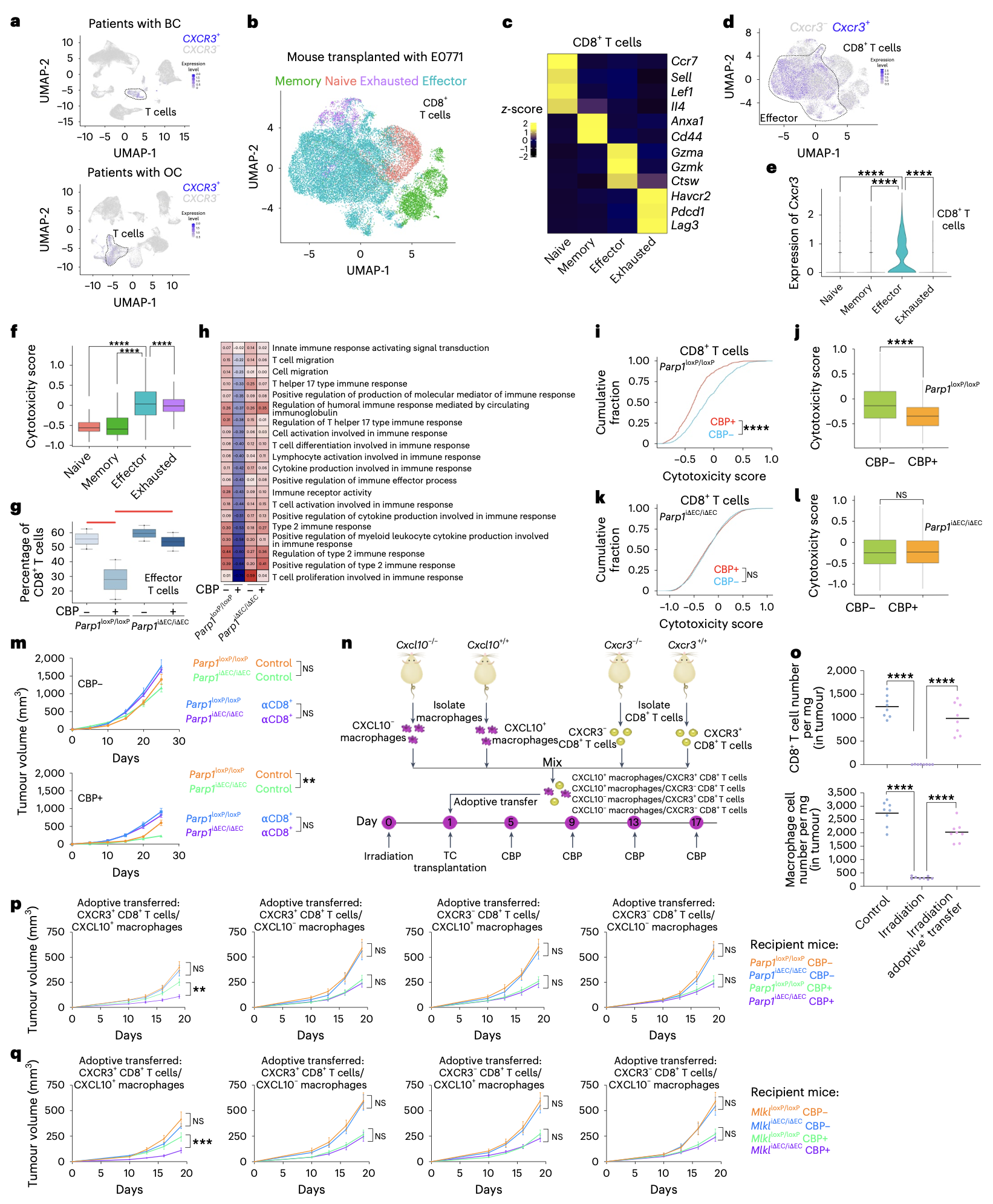 最后,在多周期化疗的小鼠卵巢癌耐药模型中,野生型小鼠肿瘤逐渐产生耐药,并伴随着SDF1持续升高、CXCL10+TAMs和CXCR3+CD8+T细胞减少。而特异性敲除内皮细胞中的PARP1或MLKL可显著延缓耐药的发生,保持肿瘤对化疗的敏感性。
