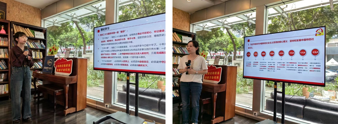 活动伊始,基础博士支部书记侯喆同志和生医生化党支部书记林佳同志分别围绕“党的二十大报告中的一些‘数字’”和“习近平新时代中国特色社会主义思想的核心内容”的主题讲授党课,带领大家深入学习党的二十大报告中的“三个务必”、“三件大事”、“六个必须坚持”、“六个如何始终”和“五个必由之路”,深刻领悟习近平新时代中国特色社会主义思想中的“十个明确”和“十四个坚持”的科学内涵以及逻辑关系。