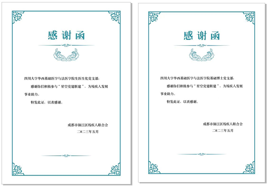 党建聚力,向光而行。通过理论学习、知识竞答、共享实践、交流沟通等丰富的活动形式,不仅让学院的师生以党员身份走进了心智障碍群体,体现友爱、团结、积极向上的品质,表达对营造帮扶残疾人良好氛围的强烈信念,推助志愿助残理念深入人心;也倡导了师生通过学习特需伙伴为融入社会做出的不懈努力,在今后的学习生活工作中保持积极乐观的人生态度和健康向上的生活方式;同时还建立了和谐的沟通环境,促进师生积极互动,营造团结互助氛围。本次活动也得到成都市锦江区残疾人联合会的支持和关注。活动结束后,成都市锦江区残疾人联合会向学院生医生化党支部和基础博士党支部分别颁发了感谢函,感谢两个支部为残疾人发展事业助力。