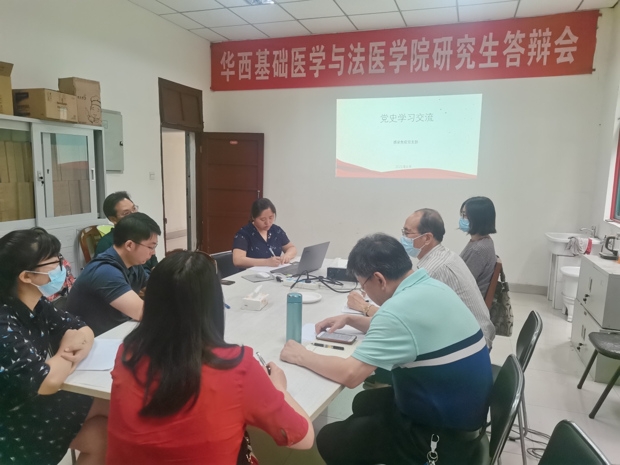 为了更深入、更有效地推进党史学习教育,贯彻落实校院两级党委下发的党史学习教育要求,2021年3月起,感染免疫党支部向支部党员推送精选红歌,如《党旗更鲜艳》《党旗飘扬的方向》等;推送精选的党员讲党的故事小视频,如《红船精神:永不停泊的红船》《决策瓦窑堡》等。在学习中,将党史学习与经典红歌曲目结合起来,加强党史学习效果。6月2日下午2点,感染免疫党支部召开全体党员大会,交流学习党史的心得体会。会议由支部书记陈达丽主持。